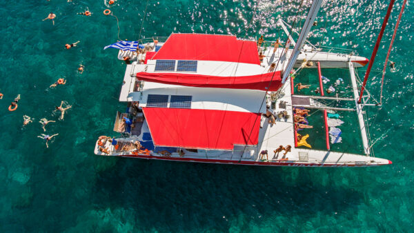 Le deuxième arrêt baignade et snorkeling se fait au large de la plage Rouge. Ensuite, vous faites une plus longue pause pour baignade, snorkeling et BBQ au large de la plage Blanche. Les plats se préparent sur place. Vous pouvez déguster des plats représentatifs de la cuisine grecque et de belles salades.
