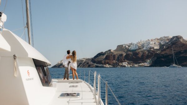 Embark on a journey of discovery as we sail in close proximity to magnificent lava creations, the historic Old Lighthouse, the majestic Black Mountain, the iconic Indian Rock, and the picturesque Asprosnissi islet. Throughout the cruise, marvel at the intricate network of islands surrounding the world’s largest Caldera, adorned with charming white chapels and traditional cliff-side cave houses.