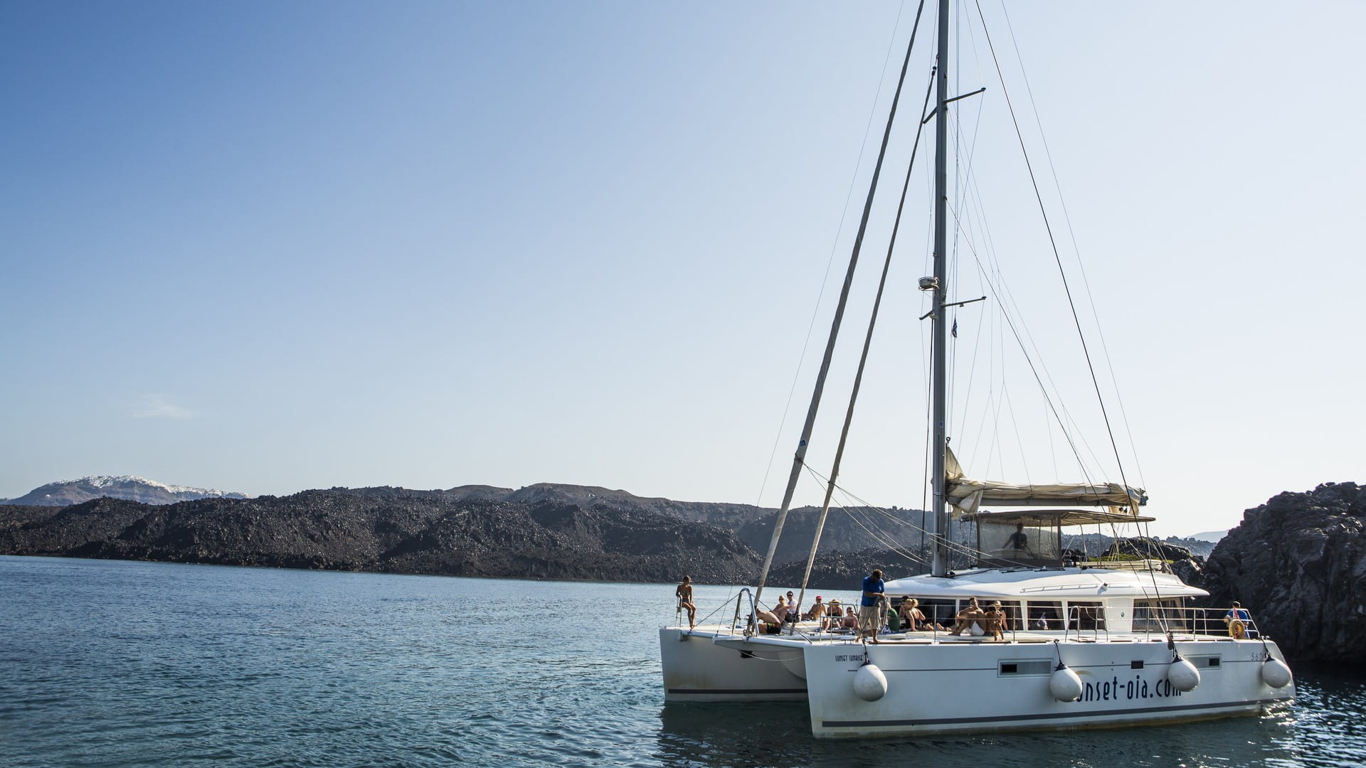 Expansive sunbeds and relaxation areas on the main deck comfortably accommodate up to 20 guests, while the upper deck features a spacious shaded lounge with canopy - perfect for panoramic views of the caldera. A professional crew is dedicated to providing attentive service and organizing tailor-made tours, special celebrations, or bespoke events on board.